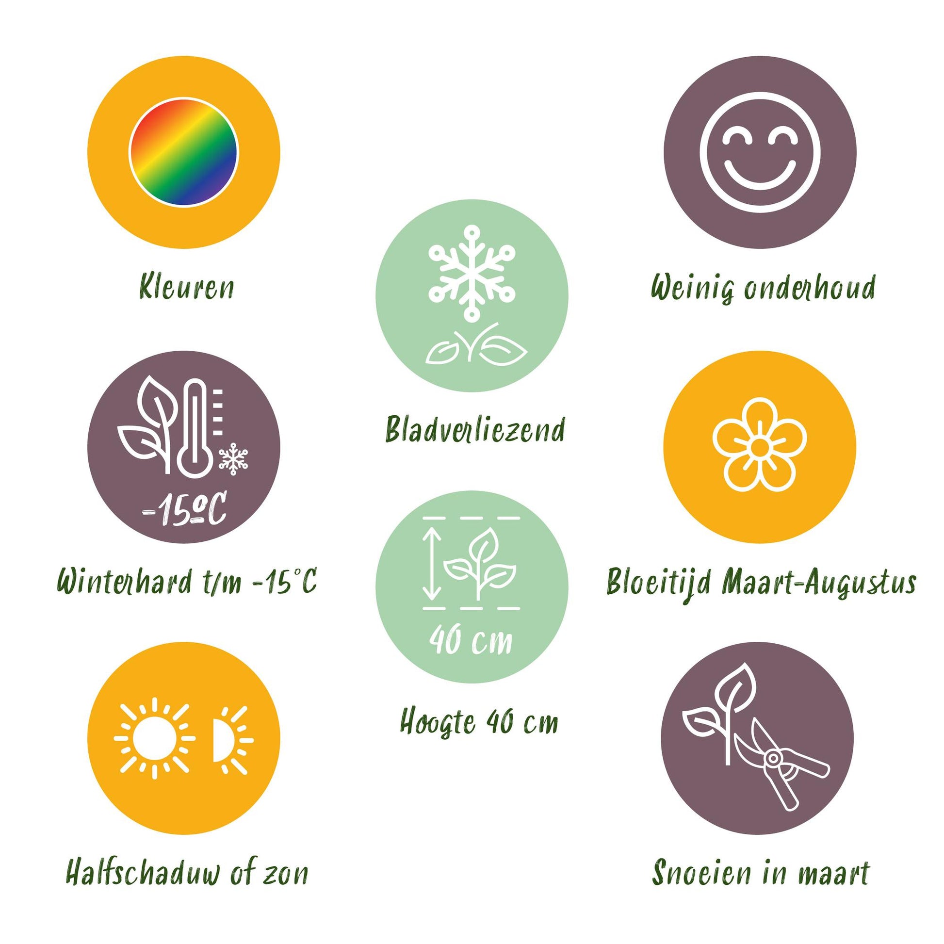 Die Pflanzen sind sorgfältig nach Farbe, Blütezeit und der Fähigkeit zur Unkrautunterdrückung ausgewählt. Die Auswahl kann je nach Saison leicht variieren, aber Sie erhalten immer eine Zusammenstellung, die zu mindestens 80% mit dem abgebildeten Foto übereinstimmt.